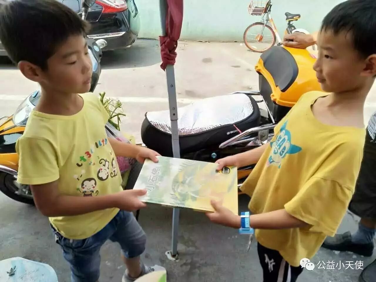 小天使说:“这是我们小区保安叔叔的儿子,放暑假刚被接来的,过几天就要回老家上学了,又要离开爸爸妈妈,跟着爷爷奶奶生活,送他一本绘本,希望他能快乐每一天!”