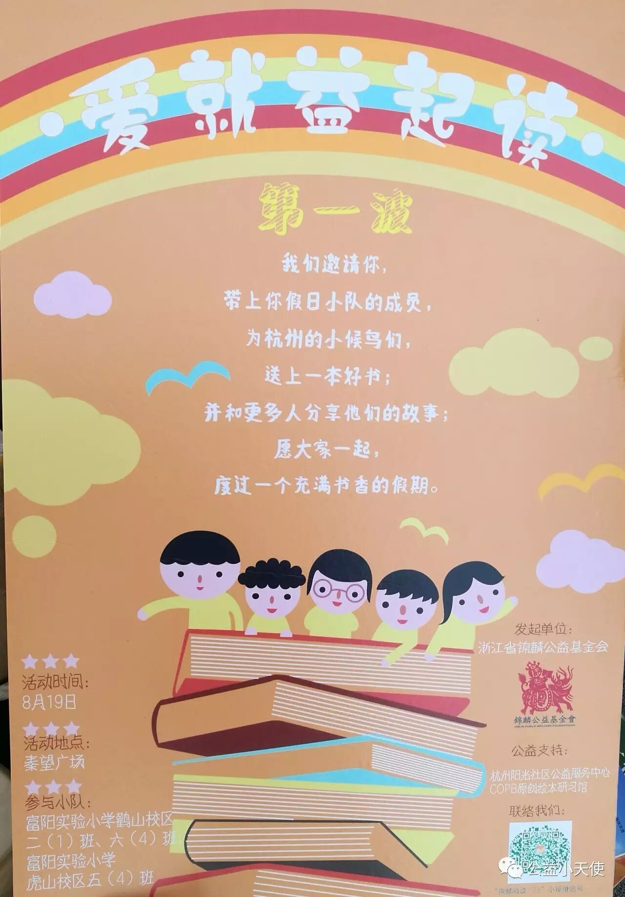 8月初,浙江锦麟公益基金会和杭州青年公益社会组织服务中心共同发起的“爱就益起读”活动。2017年8月19日在富阳地区开展第一波活动,此次“爱就益起读”由浙江省阳光社区公益服务中心、富阳公益小天使承办,在富阳秦望广场雷锋角正式开展。