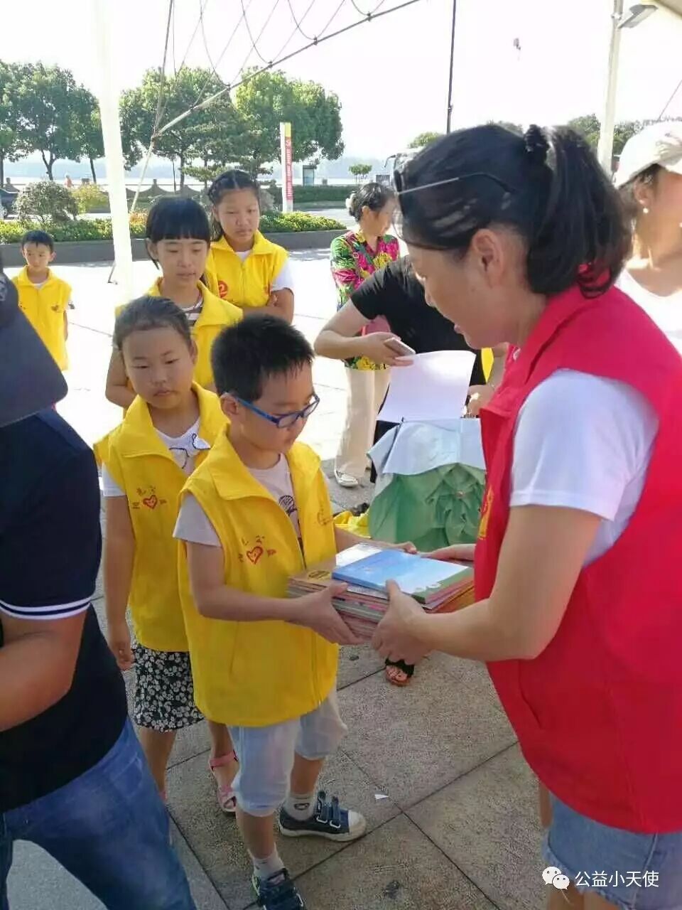炎炎夏日也挡不住小天使们的热情,大家早早的就在雷锋角等候书籍的到来。